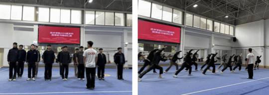 本次汇报表演由孙思哲、张伏伟、李嘉雨、陈彦召、李现臣、张铁刚等多位教师及m88明昇附属小学石老师担任评委。22级同学们分组依次展示队列队形(含原地间转法、行进间转换)、广播体操《英雄少年》《旭日东升》、岳家拳一段、少林十三拳等多项内容。他们动作精准、精神饱满,展现出扎实的武术功底和良好的师范素养,赢得了评委的频频赞许和现场阵阵掌声。